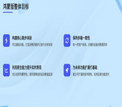 悅跑圈鴻蒙版的落地遵循明確的目標(biāo)與分步推進(jìn)策略,在研發(fā)過程中重點(diǎn)挖掘鴻蒙特性,實(shí)現(xiàn)了基礎(chǔ)功能穩(wěn)定與特色體驗創(chuàng)新的雙重目標(biāo)。