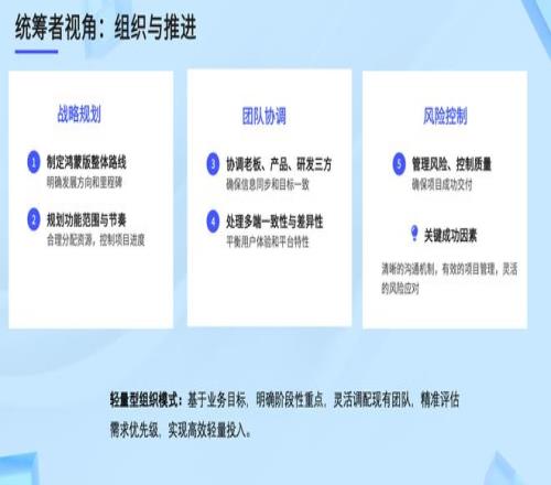 - 戰(zhàn)略規(guī)劃:制定鴻蒙版整體路線,明確發(fā)展方向與里程碑,規(guī)劃功能范圍與節(jié)奏,合理分配資源、控制項目進(jìn)度。